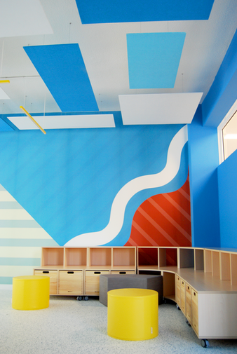 El corazón del diseño se encuentra en el techo acústico, concebido a partir de la geometría de los sillares del torreón representados en el logotipo del centro. Esta referencia se traduce en una composición de paneles rectangulares y cuadrados en diferentes tonos de azul, dispuestos a la misma altura y cubriendo toda la superficie del techo. Además de su función estética y simbólica, este techo cumple un propósito funcional: mejorar la acústica del espacio, creando una atmósfera envolvente que invita al bienestar, la concentración y la conexión con el entorno.